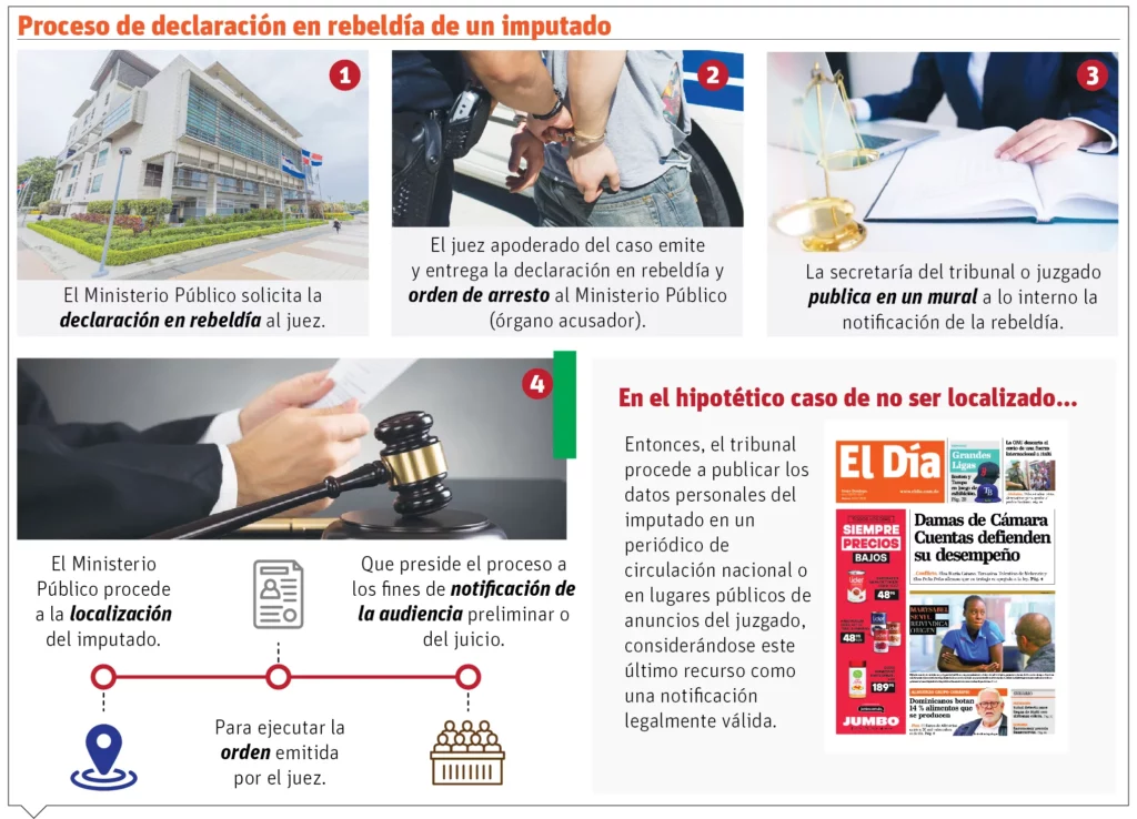 A través del Departamento de Captura de Prófugos, Rebeldes y Condenados, cuando se recibe la resolución emitida de un tribunal, donde se declara la rebeldía del imputado y orden de arresto, esta se tramita y se remite a la Policía Nacional para que se ejecute. Al ser arrestado el imputado, se presenta ante el juez para que se continúe el proceso que se le sigue a ese encartado.