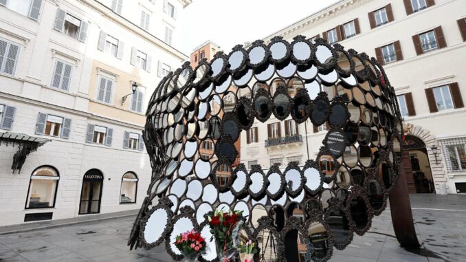 Varios ramos de flores en honor a Valentino lucían a los pies de la escultura “I’ll Be Your Mirror”, una enorme máscara de bronce realizada con espejos ovalados perteneciente a la exposición “Venus".
