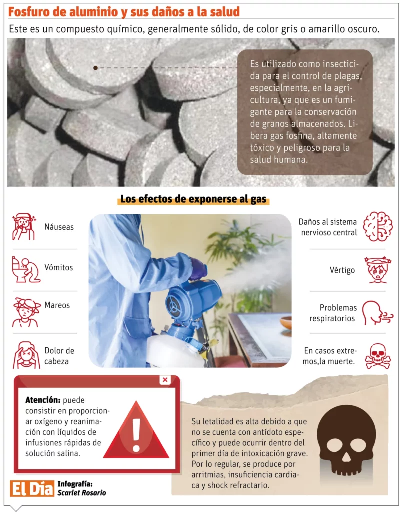 Sin embargo, a pesar de su eficacia en ese ámbito, la fosfina que genera su aplicación es un gas altamente tóxico, que conlleva serios riesgos y efectos perjudiciales para la salud humana, llegando a ocasionar, incluso, la muerte, como ha ocurrido con dos miembros de esa familia.