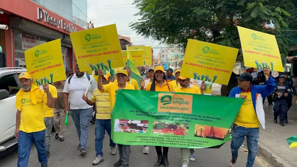 Santo Domingo Este.– El Partido Frente Amplio realizó este domingo su cuarta caminata de protesta en el municipio Santo Domingo Este, en rechazo al alto costo de la canasta básica familiar y en exigencia de la rebaja de los precios de los alimentos y las medicinas.