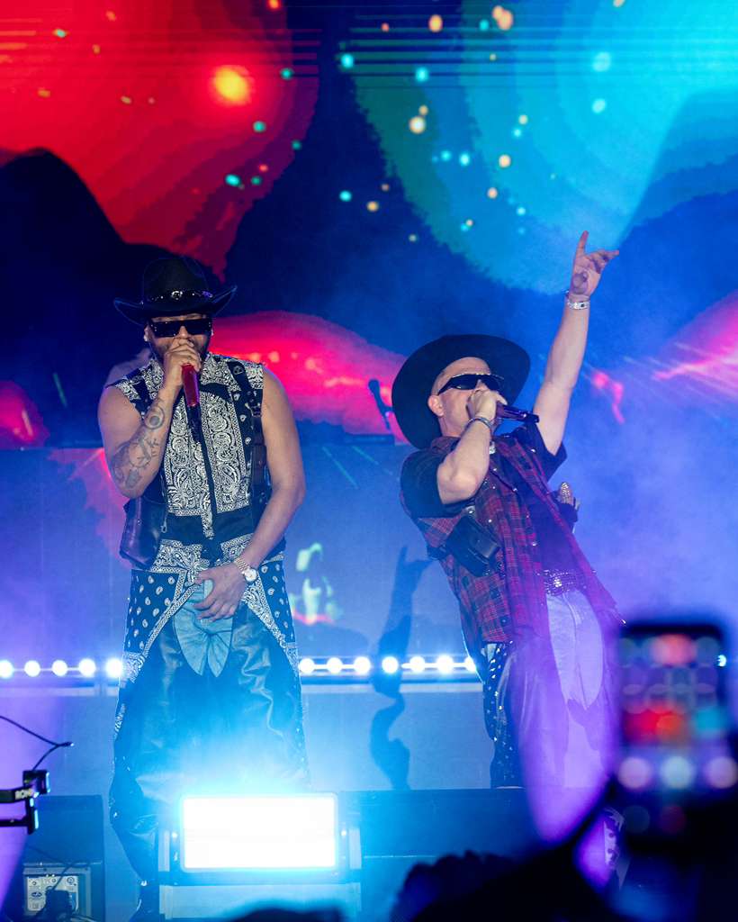 Más tarde, el dúo urbano transformó por completo la escena con un segundo concepto “cowboys brillantes”, mezclando lo vaquero con destellos, texturas y luces que acompañaron el ritmo intenso de la madrugada.