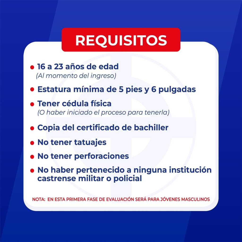 Las jornadas de evaluación comenzarán a partir de las 7:30 de la mañana y estarán dirigidas a jóvenes masculinos bachilleres interesados en integrarse a esta institución militar.