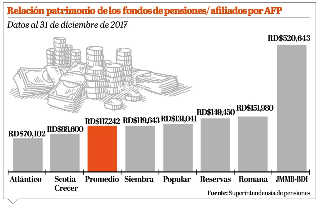 Los fondos de pensiones son manejados por siete AFP, dos de las cuales, según la Superintendencia de Pensiones, administran casi el 60 % de los fondos (AFP Popular y Scotia Crecer). Lo chocante es que el 76 % de esos fondos, es decir, RD$349,232 millones, están en manos del Gobierno, ya que fueron invertidos en instrumentos del Banco Central y del Ministerio de Hacienda.