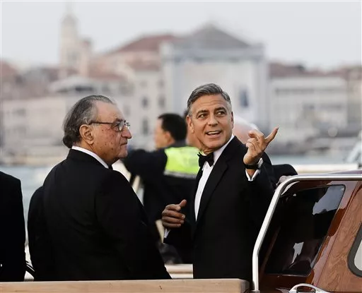 Personal del hotel en el lujoso hotel Cipriani formó una barrera de protección entre Clooney y sus invitados, pero aun así el actor mandó algunos saludos con la mano.