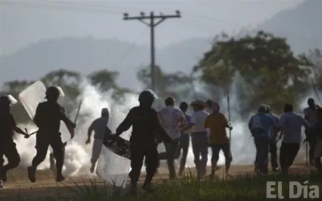 La policía arrestó a centenares de indígenas armados con arcos y flechas en un violento operativo y los introdujo a autobuses para retornarlos a su lugar de origen, pero la caravana fue frenada por pobladores de una localidad vecina quienes prendieron fogatas en la ruta.