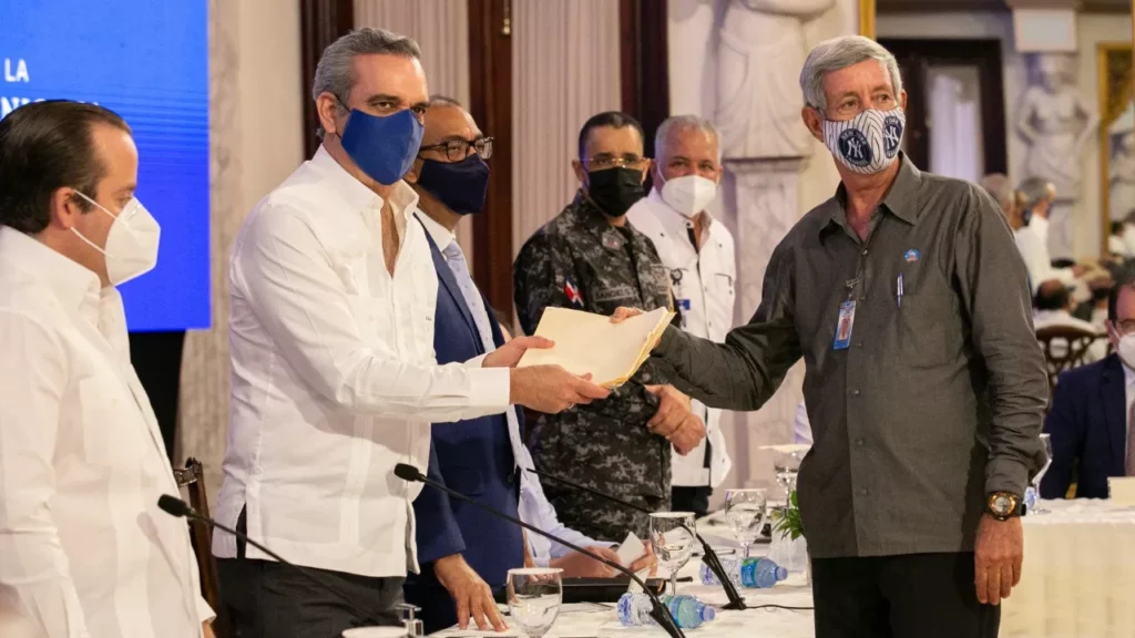 El presidente Abinader junto a varios funcionarios gubernamentales, escucharon los planteamientos de Sergio González, María Flores, Luis Gil, Aurelio Mateo, Santa Diroche, Silvio Nerys, Lucrecia Reyes, Merquiades Melenciano, Virtudes Reyes, Víctor Polanco, Awilda Batista y Daurys Alvarez.