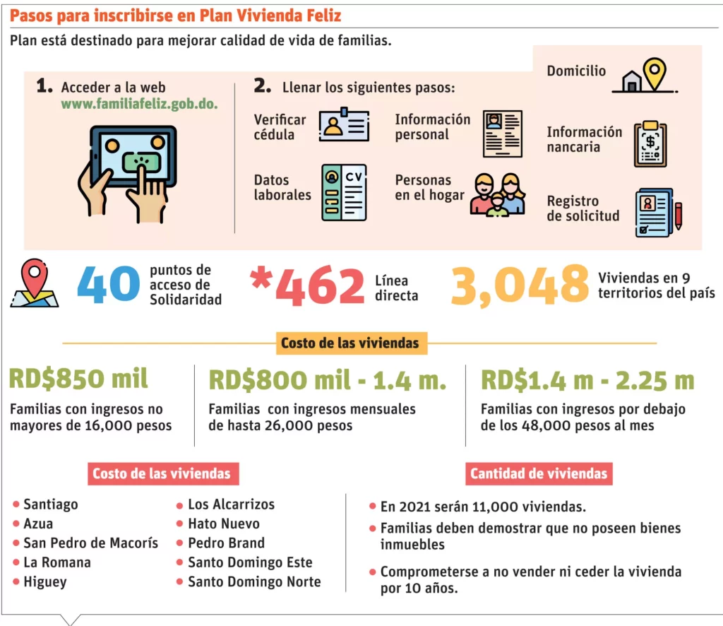 Entre las condiciones para ser beneficiario de una vivienda de dicho plan está él que los adquirientes no tengan casa registrada en la Dirección General de Impuestos Internos, que los hijos de la familia estén inscritos en la escuela o ser parte de un plan de capacitación.