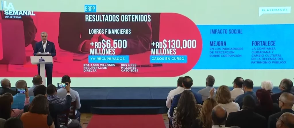 La información fue ofrecida por el presidente Luis Abinader en La Semanal con la Prensa, quien precisó que estos recursos fueron obtenidos a través del Equipo de Recuperación del Patrimonio Público, que preside Fernando Henríquez, y de otras instituciones.