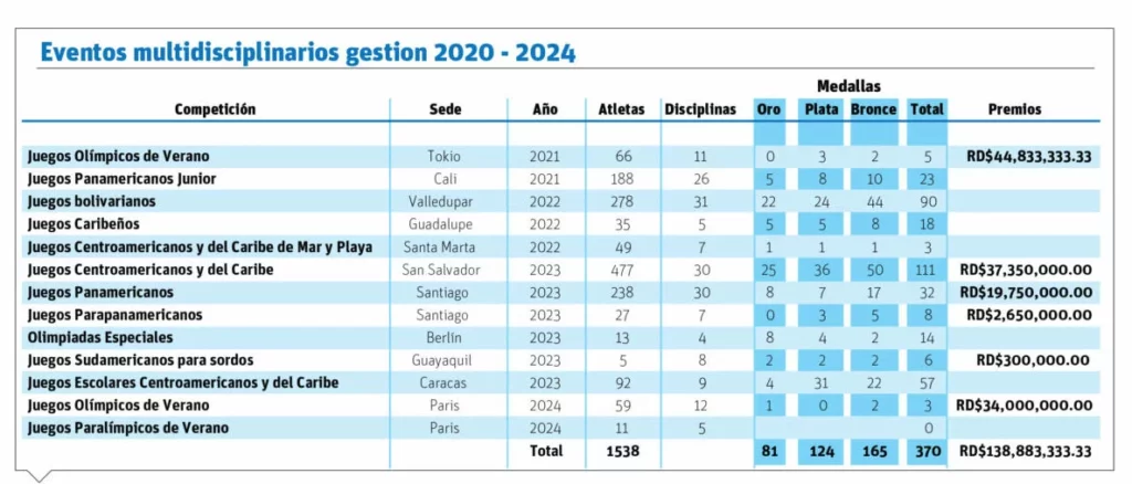Durante el cuatrienio 2020-24, un total de 1,538 atletas han salido beneficiados, tras destacadas actuaciones en seis juegos, a los cuales se han destinado 138,883,333,33 millones como premios metálicos.