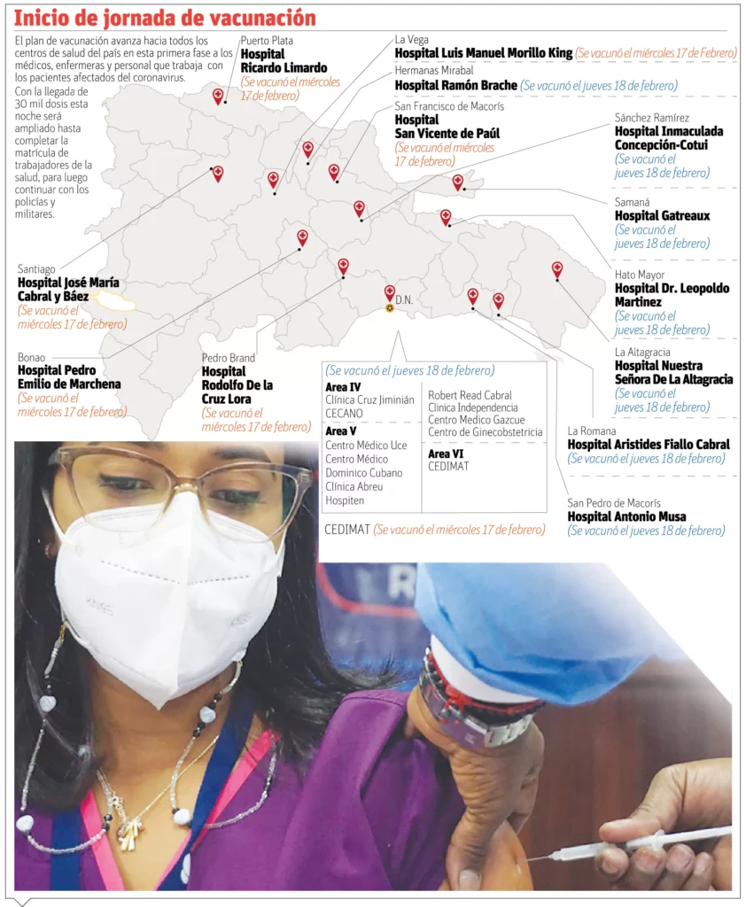 Ayer el Plan de vacunación “Vacúnate RD” abarcó diferentes hospitales del país, entre los que están la Clínica Cruz Jiminián, Hospital Robert Reid Cabral, la clínica Ureña, en Villa Mella, entre otros centros de sanitarios.