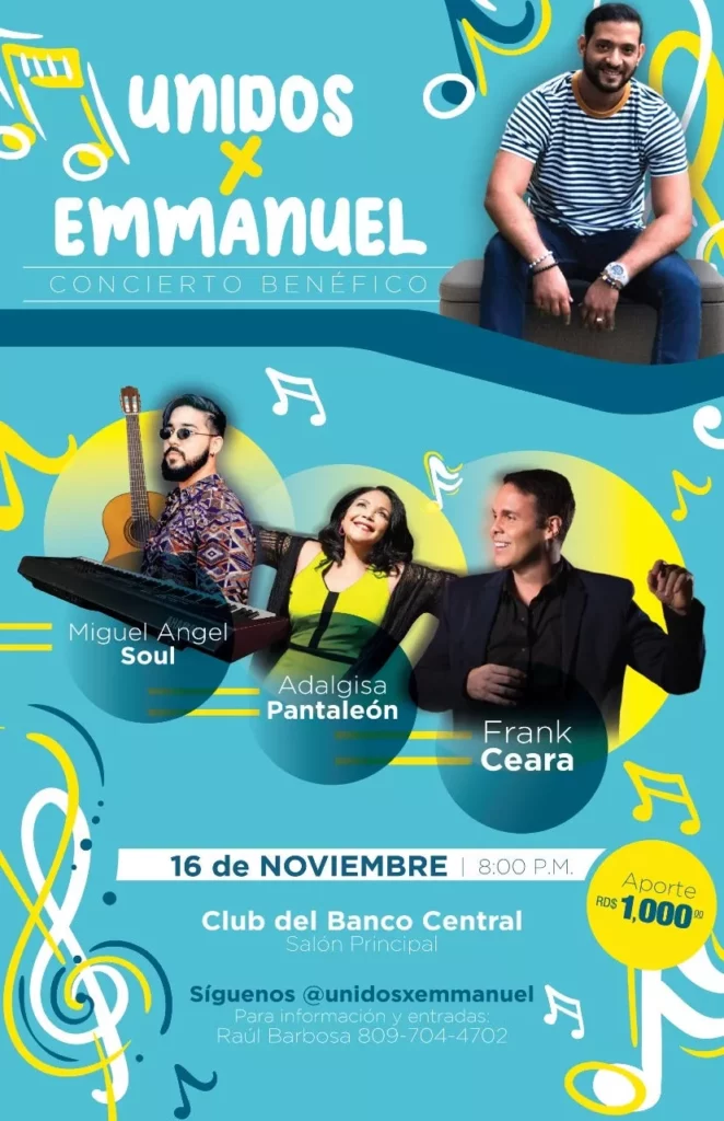 Santo Domingo.- Frank Ceara, Adalgisa Pantaleón y Miguel Ángel Soul se unirán en un concierto benéfico este próximo 16 de noviembre a las 8:00 de la noche en el Club del Banco Central, pro-recaudación de fondos para el trasplante de médula ósea del joven Emmanuel, a quien le diagnosticaron cáncer de Linfoma de Hodking.
