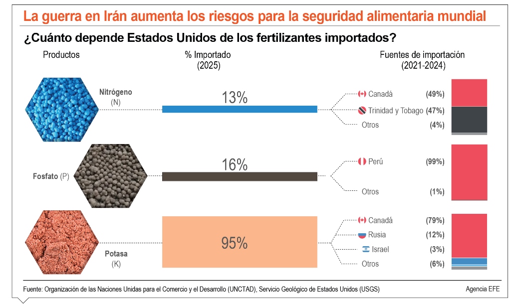 “No queremos ser alarmistas sino realistas y eso significa entender que estamos ante desafíos enormes”, sostuvo. Recordó que el Golfo Pérsico es uno de los mayores centros de producción de fertilizantes y que cerca del 30 % del comercio mundial de estos productos transitan por el estrecho de Ormuz, por lo que las interrupciones en esta arteria amenazan el sector agrícola, especialmente en Asia, África y Oriente Medio. “Una menor producción agrícola podría desencadenar efectos en cadena en los productos alimenticios básicos, donde la escasez de granos impulsa aún más la inflación de los precios de los alimentos y agrava el hambre en países de bajos ingresos dependientes de las importaciones”, indica el informe.