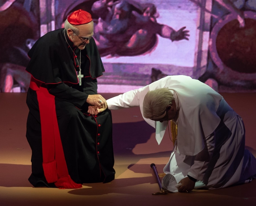 A esta fuerza visual se suma un impresionante trabajo actoral que sostiene la columna vertebral del montaje. El elenco principal brilla con intensidad: José Guillermo Cortines encarna a un papa Francisco contenido, humano y vulnerable, mientras Pepe Sierra ofrece una interpretación magistral de un Benedicto XVI sólido, racional y profundamente institucional.