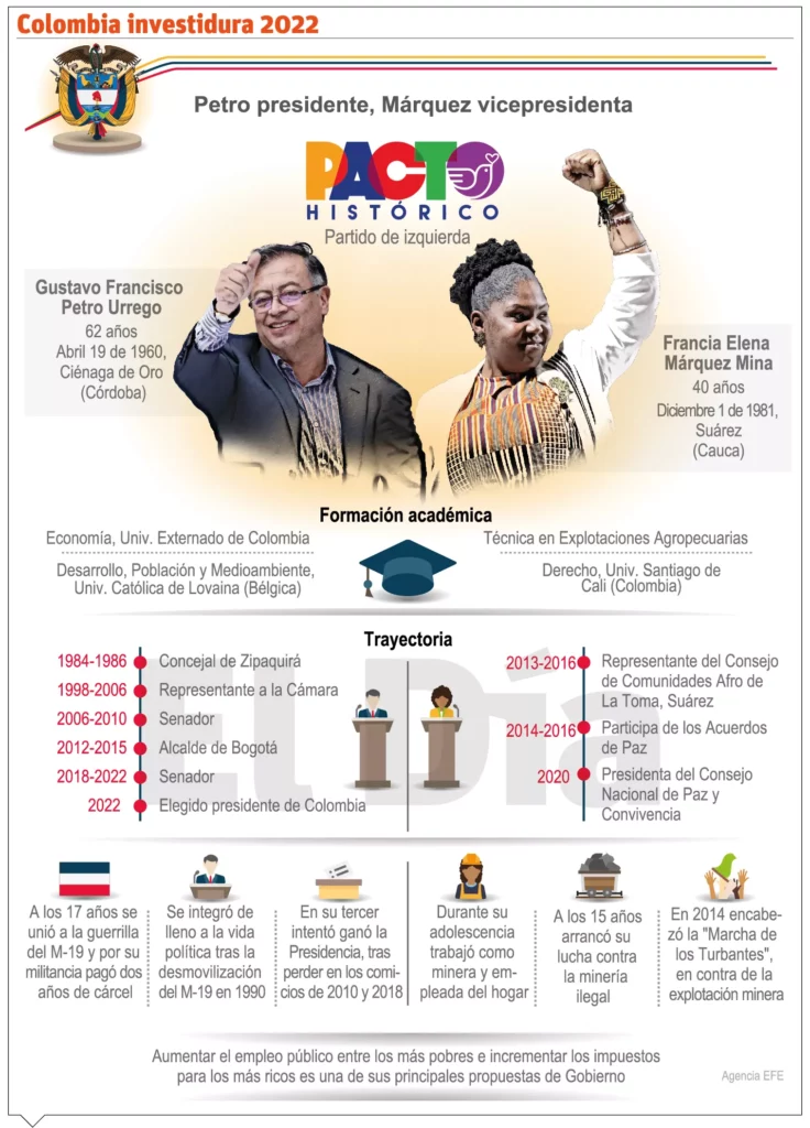 En un acto colmado de simbolismos en la Plaza de Bolívar, centro político e histórico de Bogotá, Petro juró defender la constitución y las leyes junto a Francia Márquez, quien también hizo historia como la primera afrodescendiente en ocupar la vicepresidencia de la nación.