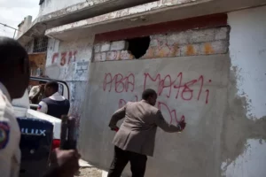 A man spray paints the message in Creole "No to Martelly" at a protest against the government of President Michel Martelly in downtown of Port-au-Prince, Haiti, Thursday, Oct. 17, 2013. People marched through the streets to complain mainly about the higher cost of living. (AP Photo/Dieu Nalio Chery)