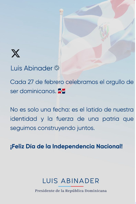 "Cada 27 de febrero celebramos el orgullo de ser dominicanos", indicó a través de su red social X.