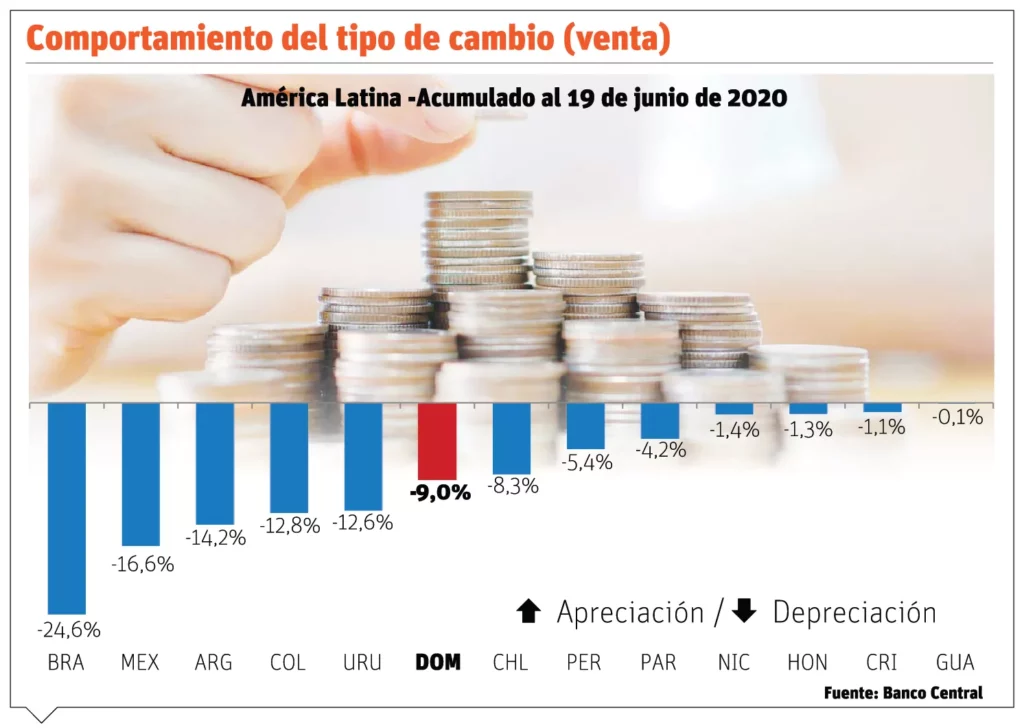 El funcionario indicó que la depreciación del peso dominicano en lo que va del año es de 9.0 %, muy inferior a la experimentada por las principales monedas de la región latinoamericana, como: Brasil, Argentina, México y Colombia, así como las economías emergentes.