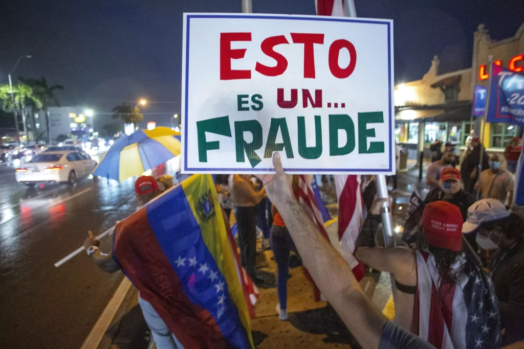 Bajo el lema de #stop The Biden Steal (paren el robo de Biden), la manifestación concentró a los seguidores de Trump un día lluvioso frente a un céntrico restaurante cubano. Vestidos de rojo y con pancartas en las que se leía “El enorme fraude”, los manifestantes exigieron que el presidente republicano continúe otros cuatro años en la Casa Blanca.