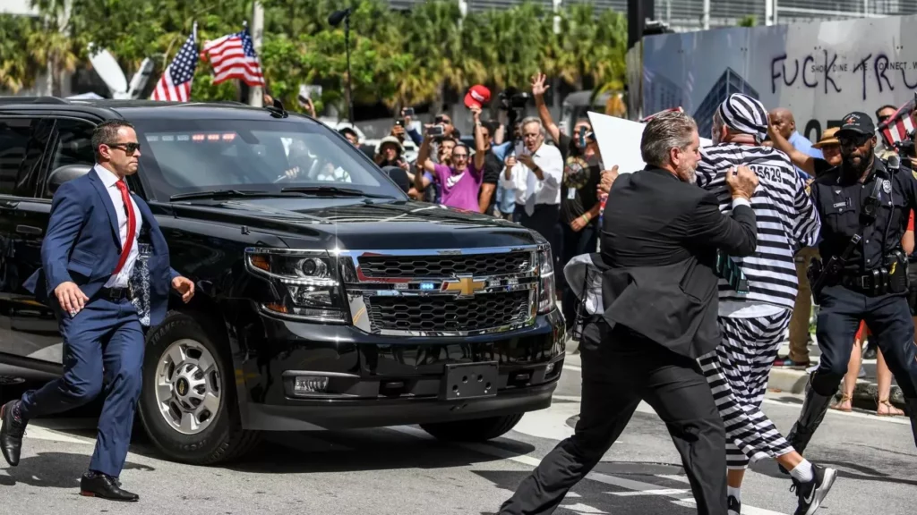 Miami.- Un hombre con traje a rayas de presidiario y una cadena con una bola atada al tobillo que se cruzó en el camino de la caravana de automóviles en la que salió este martes el expresidente de EE.UU. Donald Trump de los juzgados de Miami dijo que “valió la pena” haber pasado la noche en el calabozo.