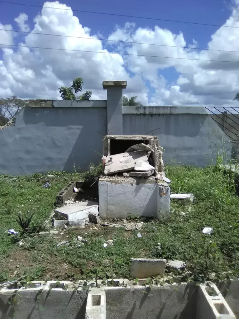 SANTO DOMINGO.– Un joven denunció este martes que un camión recolector de basura del Ayuntamiento de Santo Domingo Norte derribó un poste del tendido eléctrico, provocando la destrucción de la tumba donde descansan los restos de su padre, en el cementerio Los Casabe.