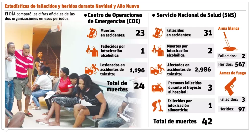 SANTO DOMINGO.-La cantidad de víctimas mortales en el último operativo de Navidad y Año Nuevo ofrecida por el Centro de Operaciones de Emergencias (COE) es casi la mitad a la que oficialmente registraron los hospitales públicos durante esos mismos días.