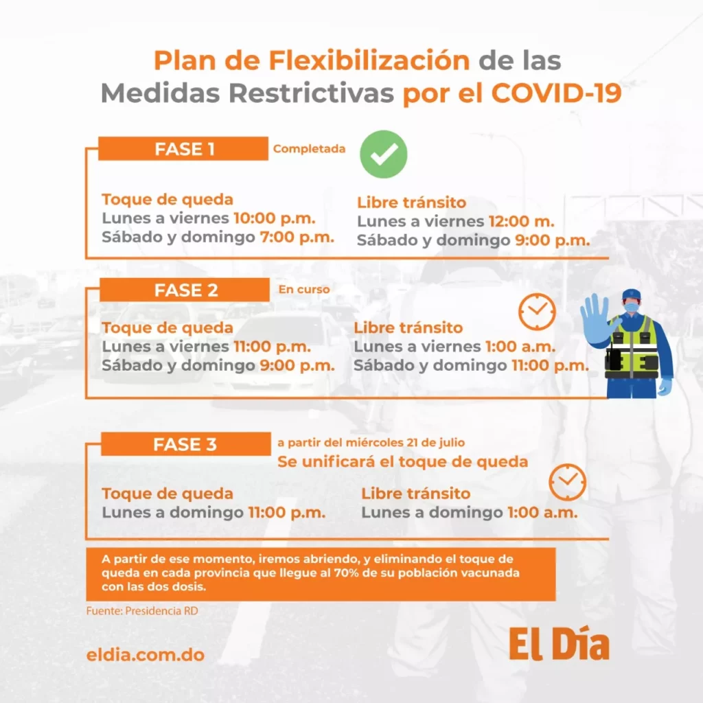 SANTO DOMINGO.-República Dominicana inicia hoy la tercera etapa del plan de desescalada de las medidas del toque de queda, exhibiendo como logro la inoculación de por lo menos 3 millones 780, personas con las dos dosis de la vacuna contra la Covid-19 y cinco millones 400 mil personas con una sola de las dosis.