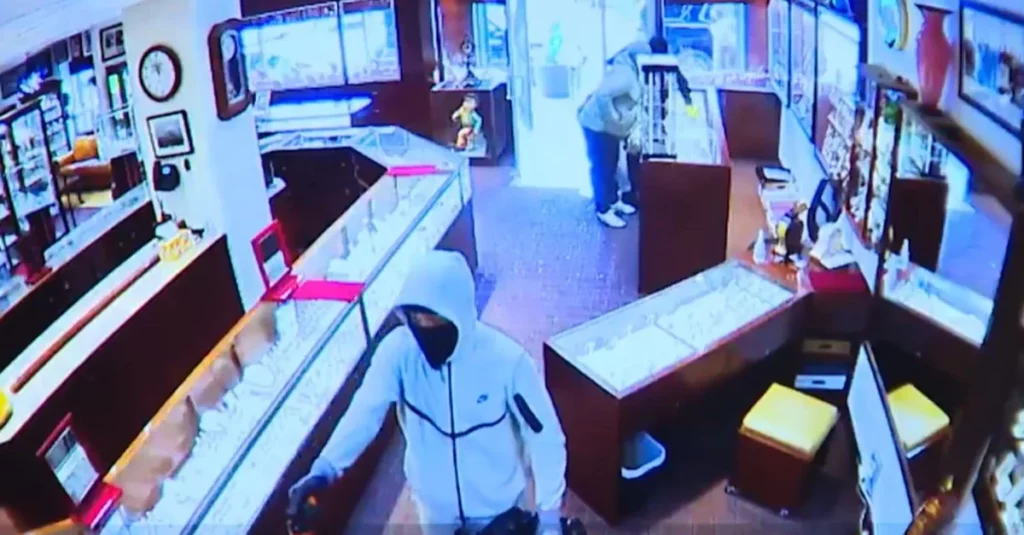 El video de las cámaras de vigilancia de la tienda en West Seattle muestra a cuatro sospechosos enmascarados romper con martillos la puerta delantera de vidrio y luego saquear seis vitrinas el jueves.