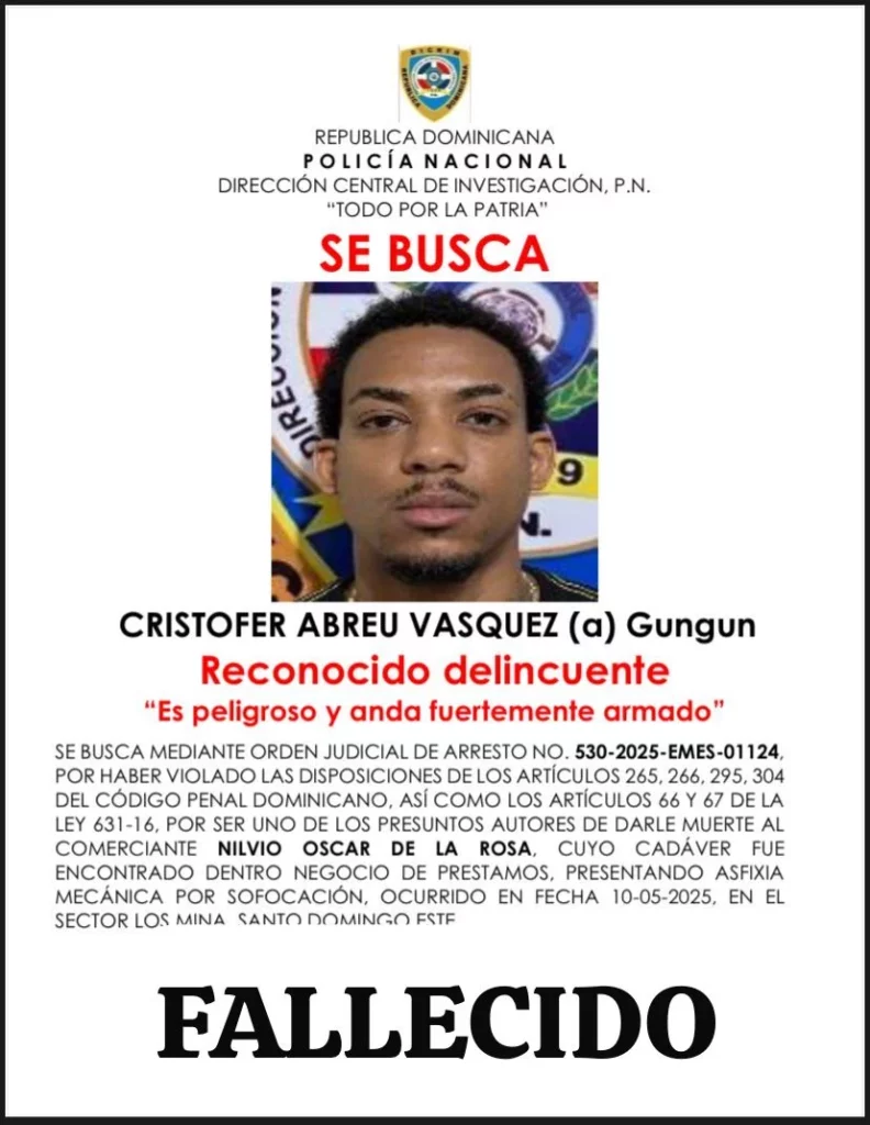 En un segundo operativo realizado en la avenida Ecológica, también en Santo Domingo Este, fueron localizados Antonio Vilorio Gómez (alias Tabaquito), Kelvin Isaac Pérez Nova (alias Vivi) y Cristofer Abreu Vásquez (alias Gungun). Este último resultó muerto tras enfrentar a tiros a los agentes que intentaban apresarlo, mientras que Tabaquito y Vivi fueron capturados en el lugar.