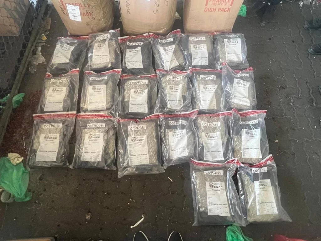 Los agentes, con el apoyo de otras agencias de seguridad del Estado, intervinieron tres cajas que contenían sacos de alimentos para perros, comida enlatada y ropa usada, procedentes de Nueva York, Estados Unidos. Dentro de estas cajas se encontraron los paquetes de marihuana camuflados, con un peso total de 42.50 libras.