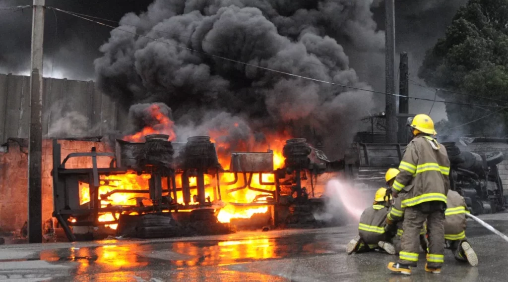 El incendio ocurrido ayer en la zona Industrial de Haina fue causado por un camión cargado de fuel oil que tumbó un poste del tendido eléctrico de alta tensión, lo que a la vez provocó un incendio y el combustible derramado entró a la compañía Termo Envases, causando daños al almacén de la fábrica.