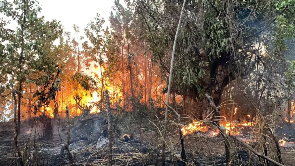 Agregó que el incendio afecta la vertiente norte y sur de Loma Guaigüí, mientras un equipo compuesto por dos brigadas de 35 de bomberos forestales de La Vega y Jarabacoa construyen líneas cortafuegos para controlarlo.