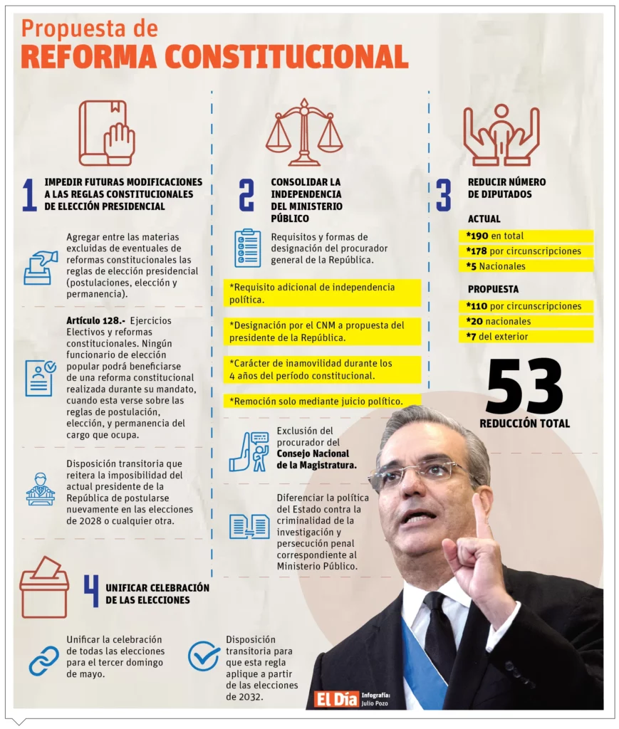 Santo Domingo .-Impedir futuras modificaciones a las reglas constitucionales de elección presidencial, consolidar la independencia del Ministerio Público, reducir el número de diputados y unificar la celebración de las elecciones son las cuatro propuestas contenidas en la reforma constitucional a la que el presidente Luis Abinader ha denominado: “Un blindaje a la democracia”.