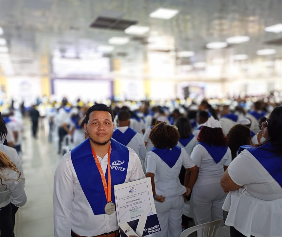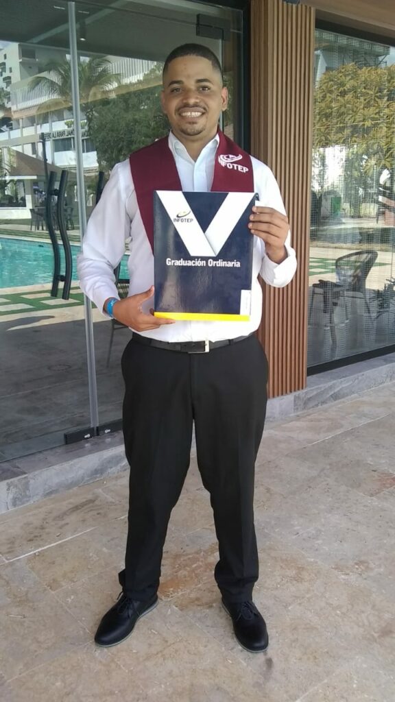 El joven, que trabaja como gestor en base a sus habilidades y cursa ingeniería en Ciberseguridad, formó parte los 2,097 nuevos técnicos formados en más de 60 áreas de alta demanda de la Graduación Ordinaria del Gran Santo Domingo, que encabezó el director general del INFOTEP, Rafael Santos.
