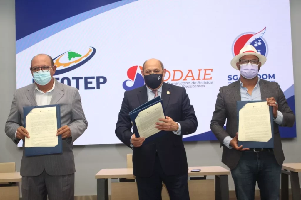SANTO DOMINGO.- El Instituto de Formación Técnico Profesional (INFOTEP), la Sociedad Dominicana de Artistas Intérprete y Ejecutantes (SODAIE) y la Sociedad General de Autores, Compositores y Editores Dominicanos (SGACEDOM), firmaron un acuerdo de cooperación Interinstitucional, con el objetivo de alcanzar la profesionalización de los autores, músicos, cantantes, y demás profesionales de la música y el audiovisual.