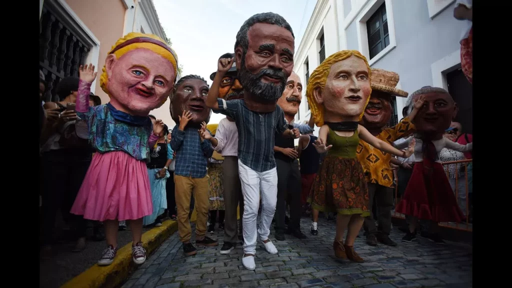La comparsa, igualmente, incluyó a varios cabezudos, entre ellos, el del historiador y antropólogo puertorriqueño Ricardo Alegría, uno de los organizadores del evento, fundado hace medio siglo.