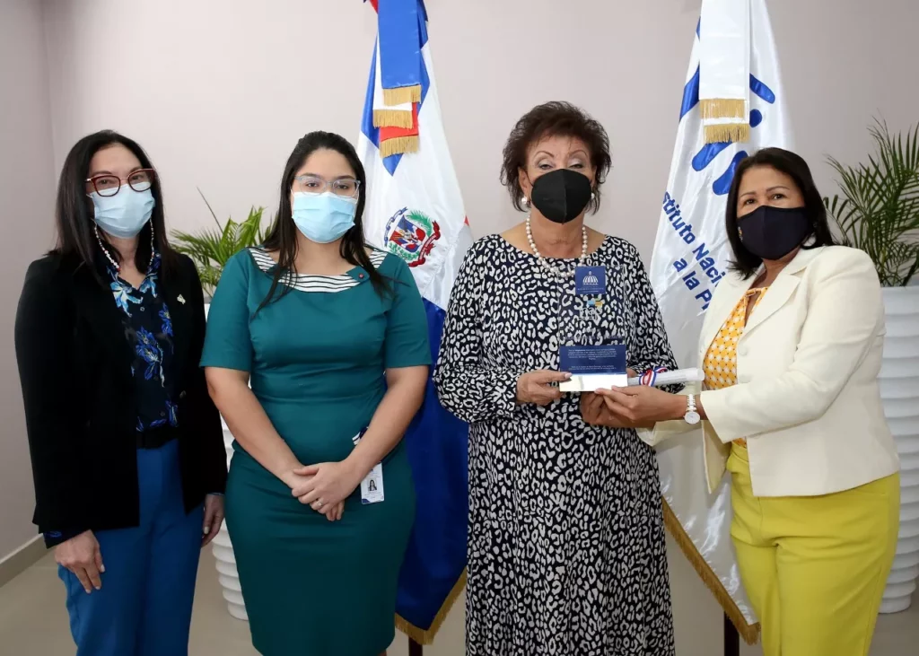 Sonia López, subdirectora del INAP, en representación del director general de esa entidad, Cristian Sánchez Reyes, entregó a Manola Santana la placa y el certificado que la reconoce por servir al Estado con devoción, honradez e idoneidad de manera dilatada.
