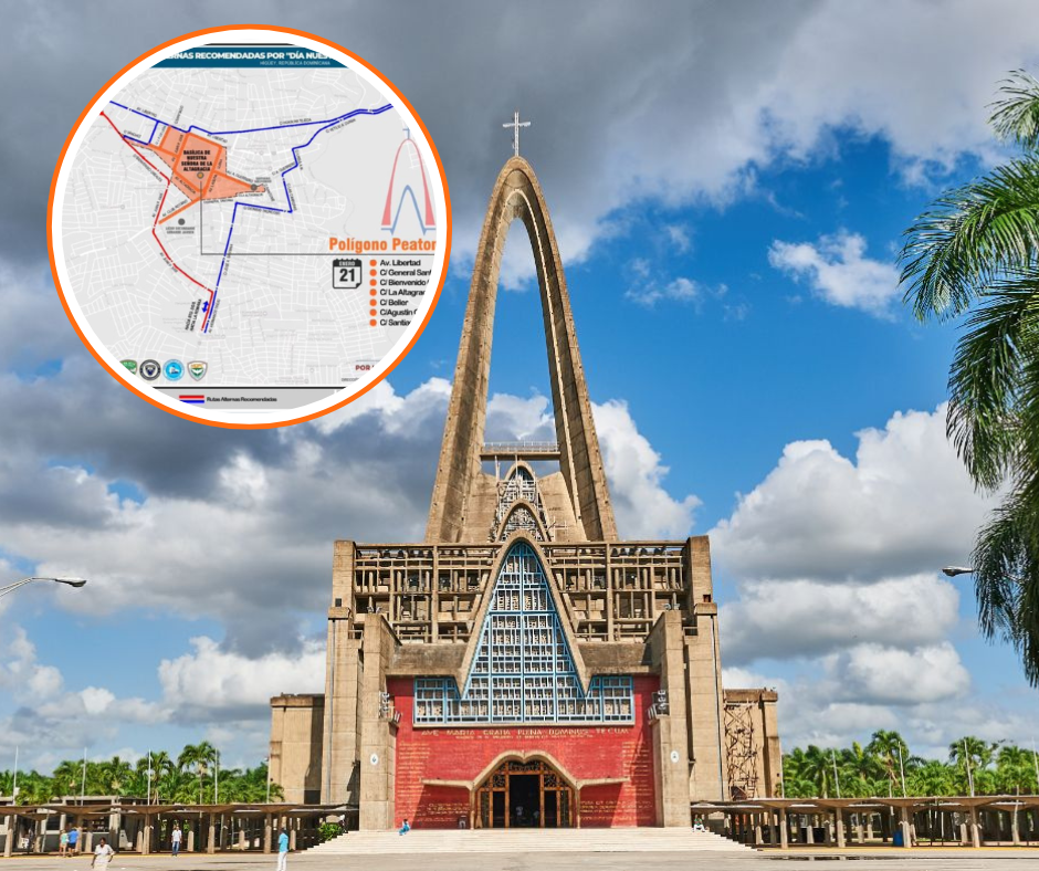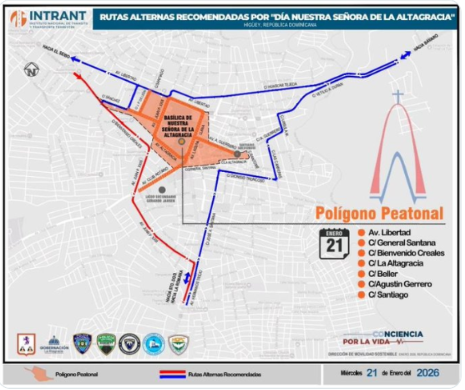 Higüey, La Altagracia.- Con motivo de la celebración del 21 de enero, Día de Nuestra Señora de la Altagracia, el Instituto Nacional de Tránsito y Transporte (INTRANT) dispuso el cierre de varias vías alrededor de la Basílica Catedral Nuestra Señora de la Altagracia, uno de los puntos de mayor concentración de fieles en el país.