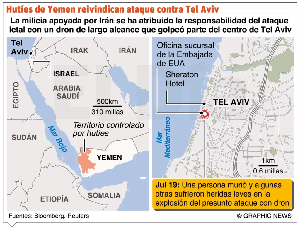 El Ejército israelí bombardeó el sábado posiciones de los hutíes en el puerto de Hodeida, en la costa del Mar Rojo, al día siguiente de que un dron de fabricación iraní lanzado por los rebeldes explotara sobre Tel Aviv y matara a un civil israelí.