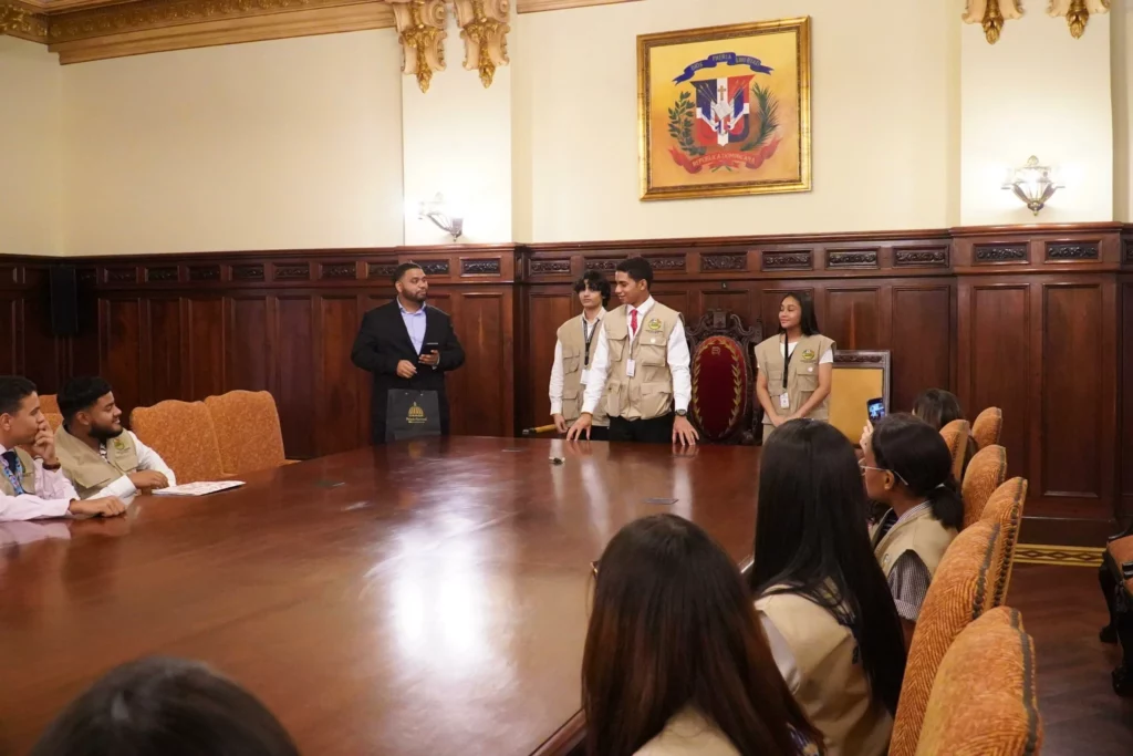 Asimismo, se les brindó información sobre la construcción del Palacio Nacional y sus inspiraciones arquitectónicas, destacando elementos del neoclasicismo, barroco y estilo imperial. También se les explicó sobre las funciones históricas de cada salón durante la dictadura de Trujillo y sus usos actuales.