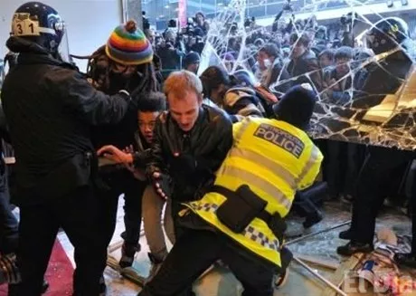 Los jóvenes rompieron ventanales en la planta baja y se introdujeron en el vestíbulo del edificio 30 Millibank, que alberga el cuartel general de la formación liderada por el primer ministro David Cameron a orillas del Támesis, en el céntrico barrio de Westminster.