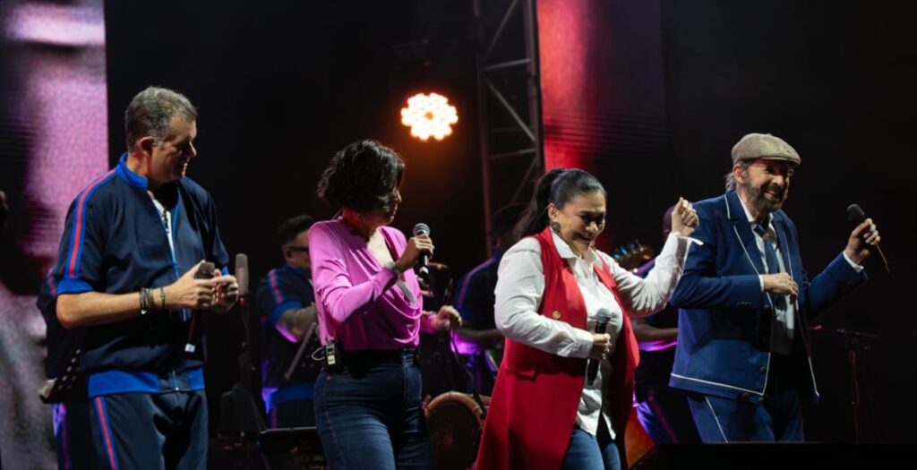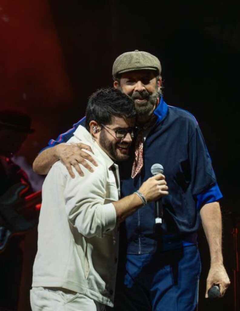 Durante dos horas, el repertorio fue un viaje por clásicos imprescindibles: “La travesía”, “Estrellitas y duendes”, “El Niágara en bicicleta”, “Bachata en fukuoka”, “El costo de la vida”, “Ojalá que llueva café”, “La llave de mi corazón”, “Como yo” y “Vale la pena”, entre muchas otras. Cada tema desataba un coro multitudinario, como si Santiago entero se hubiera convertido en una sola voz.