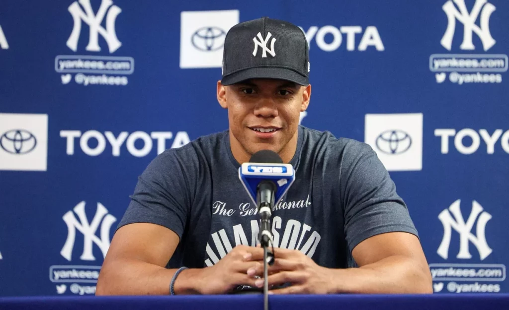 Ubicado en el podio en un área del lado de la tercera base del hogar primaveral de los Yankees, Soto lucía tranquilo. Se puso una gorra con las letras ‘NY’ mientras vestía una camiseta con su propio nombre, anunciando la llegada de “el generacional Juan Soto”.