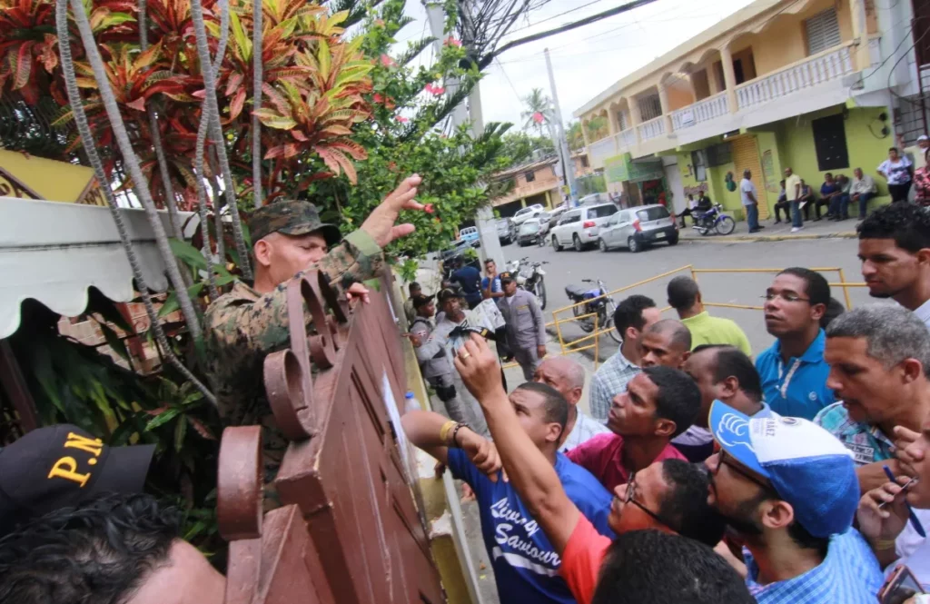 Santo Domingo.-Empujones, forcejeos y palabras fuera de lugar entre delegados de los partidos y la seguridad de la Junta municipal de Santo Domingo Oeste era el panorama que se vivía ayer, al impedirles la entrada al local donde se realiza el conteo de los votos del nivel C-1 correspondiente al voto preferencial.