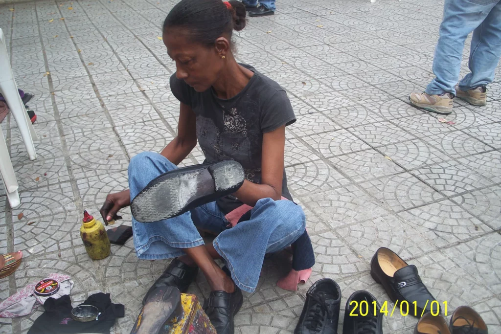 San Cristóbal. Desde hace 20 años su precariedad económica y la falta de oportunidades han obligado a Justina de Los Santos “La Morena” a lustrar zapatos para poder dar de comer a sus cuatro hijos.