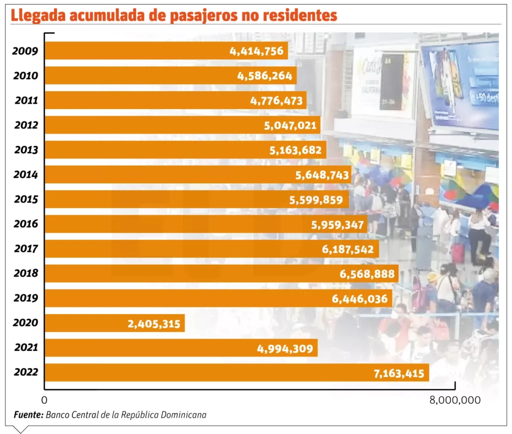 El mes de diciembre marcó la diferencia en llegada de pasajeros al ingresar al país 2,237,402 visitantes, partiendo de que hasta noviembre habían ingresados más de ocho millones de turistas y hasta el pasado martes, la llegada de visitantes superó los 10 millones de turistas, aun sin concluir el año, dijo David Collado al explicar que el trabajo del sector privado ha sido clave para alcanzar dicha meta y plantearse futuras.