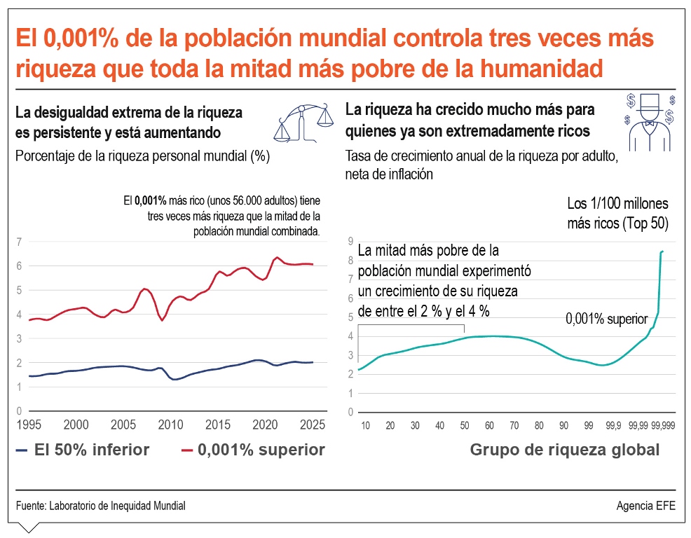 En la tercera edición de su Informe sobre la Desigualdad Mundial publicado ayer, el WIL, conocido por sus posiciones en favor de un impuesto mundial al patrimonio de los multimillonarios, denuncia “una pequeña minoría que ejerce un poder financiero sin precedentes mientras miles de millones de personas siguen excluidas incluso de la estabilidad económica básica”.