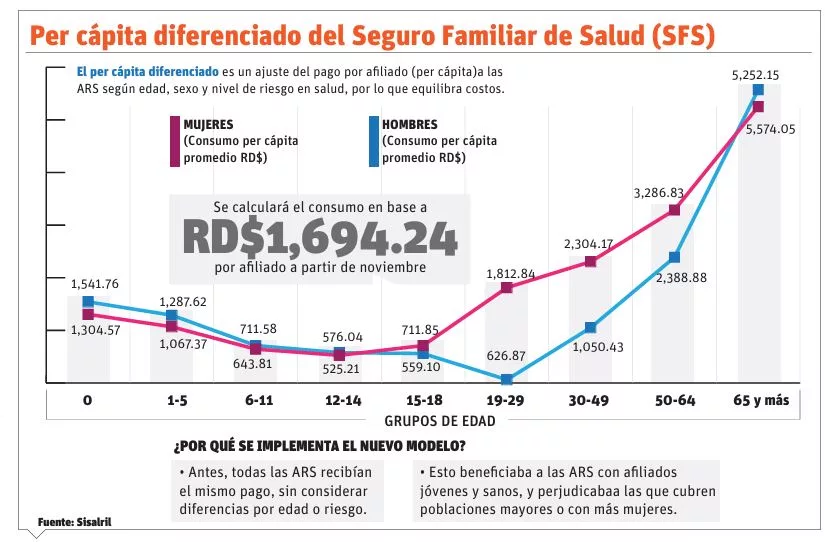 El per cápita diferenciado no es más que asignar un mayor pago por afiliado (per cápita) a las administradoras de riesgos de salud (ARS) cuando se trata de poblaciones con mayor riesgo de enfermar o con necesidades de atención y un menor monto para los de escasos riesgos.