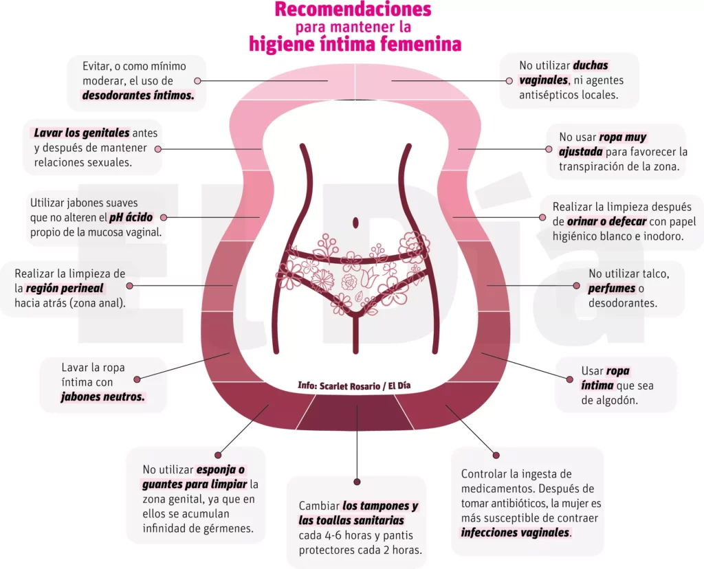 Agrega que la correcta higiene íntima de la mujer se consigue a través de una serie de cuidados específicos. Debido a las características biológicas de las zonas íntimas, estos deben observarse minuciosamente para así evitar infecciones y otras patologías.