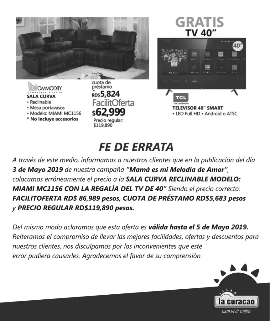 A través de este medio informamos a nuestros clientes que en la publicación del día 3 de mayo de 2019 de nuestra campaña "Mamá es mi Melodía de Amor", colocamos erróneamente el precio a la SALA CURVA RECLINABLE MODELO: MIAMI MC1156 CON LA REGALÍA DEL TV DE 40″, siendo el precio correcto : FACILITOOFERTA RD$86,989 PESOS, cuota de préstamo RD$ 5,683 pesos y PRECIO REGULAR RD$119,890 PESOS.