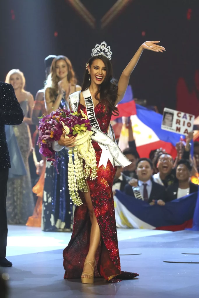 Con una amplia sonrisa, la belleza filipina obtuvo la tiara de manos de su predecesora, la sudafricana Demi-Leigh Nel-Peters, y desfiló frente a un público entregado que coreó desde el inicio de la gala su nombre.